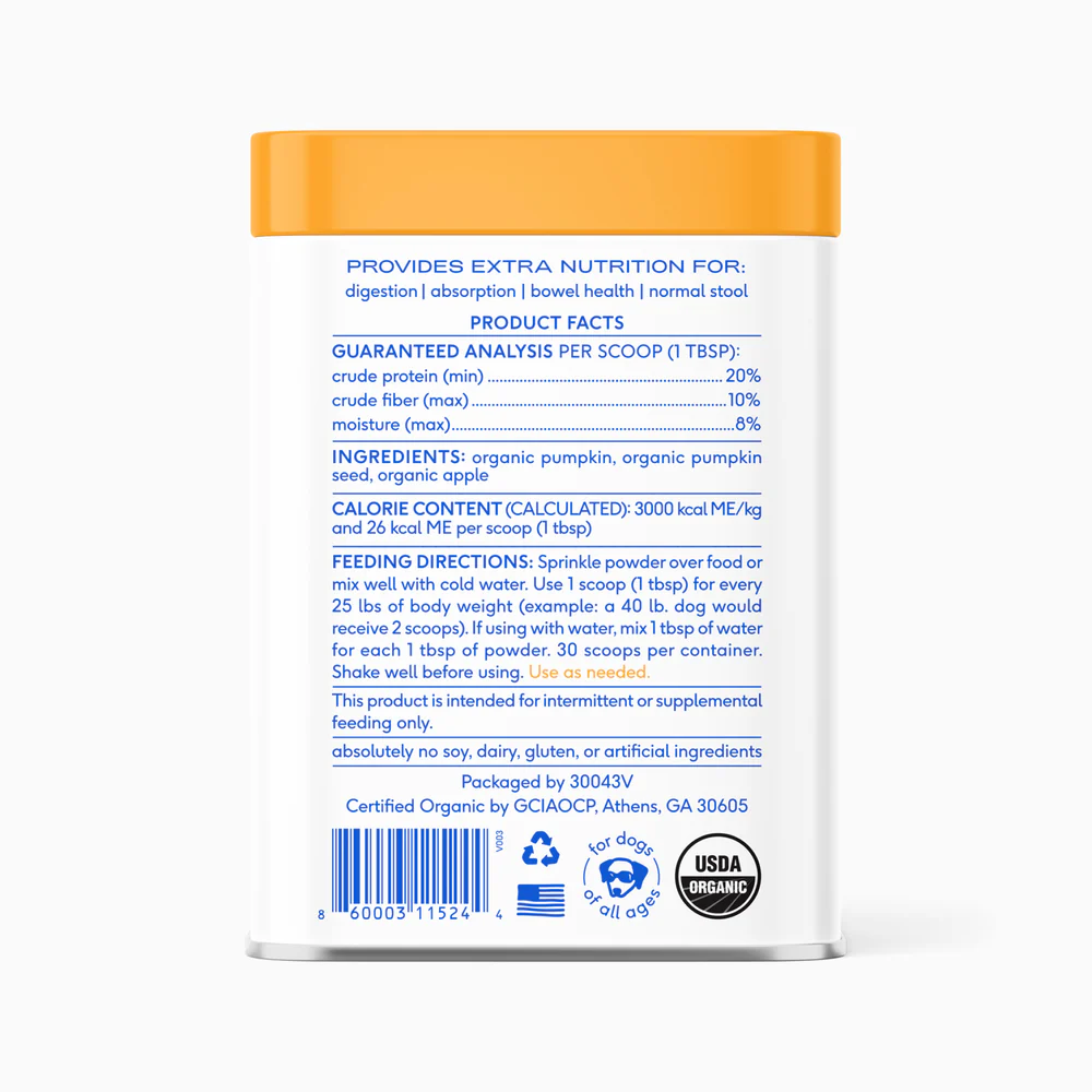 Our Pumpkin Powder formulation is unique in that it is made with organic pumpkin, organic pumpkin seed, and organic apple. Apple and Pumpkin have complementary sources of dietary fiber that ensure a pure and effective product. Additionally, it’s formulated with the guidance of board-certified veterinarians, focusing on supporting digestive health with no unnecessary ingredients.